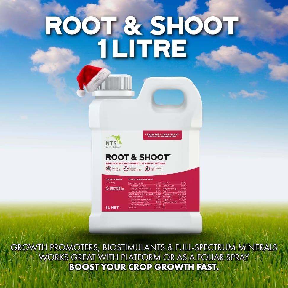 2) Root and Shoot - 1 litre - this is my personal favourite, amongst the wide range of NTS liquid options. It is an all-encompassing formula that includes plant growth promoters, biostimulants, and a full spectrum of minerals, including less common elements such as selenium, iodine, cobalt, and molybdenum. There is tremendous benefit in combining Root and Shoot with Platform to kickstart your crop, and it is also a super productive foliar spray at any stage of the crop cycle.