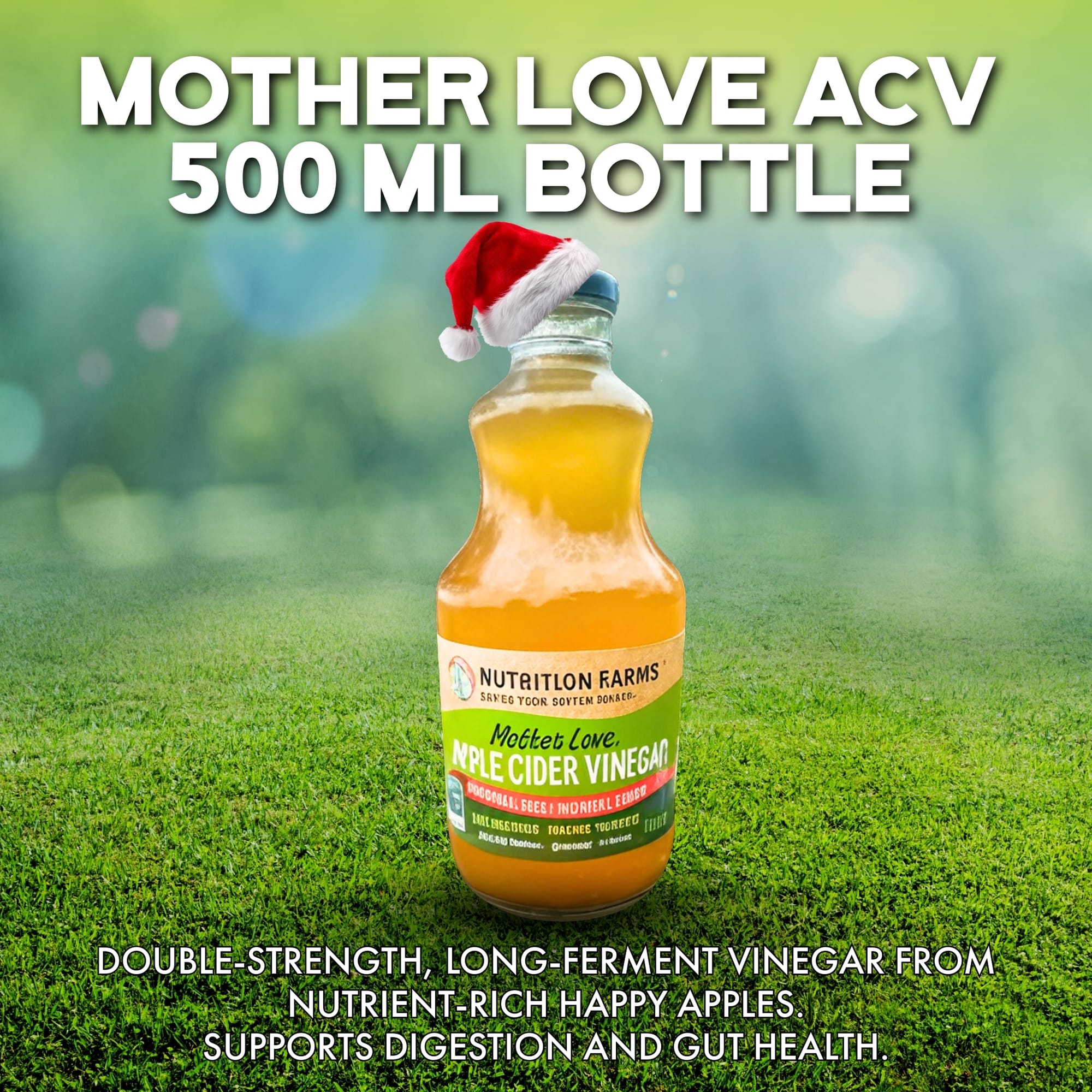 2) Mother Love Apple Cider Vinegar - 500 ml bottle - this long ferment, double strength ACV is produced from our nutrient dense, chemical free Happy Apples and it is terrific for dressings or as a gut supporting health supplement.