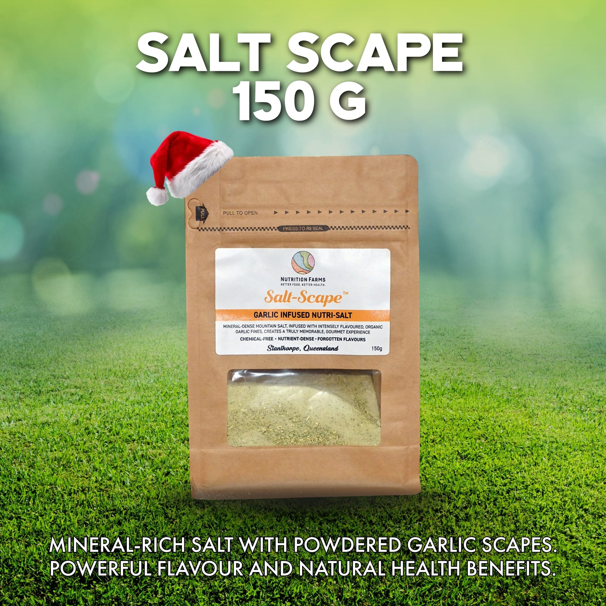 3) Salt Scape - 150 grams - a super salt featuring a combination of highly mineralised Nutri-Salt, with dehydrated, powdered garlic scapes. The scape is the flowering organ of the garlic, and it features exceptional levels of allicin and other medicinal compounds. If you like garlic, you will struggle to settle for anything else, once you have experienced this memorable food enhancer/health supplement