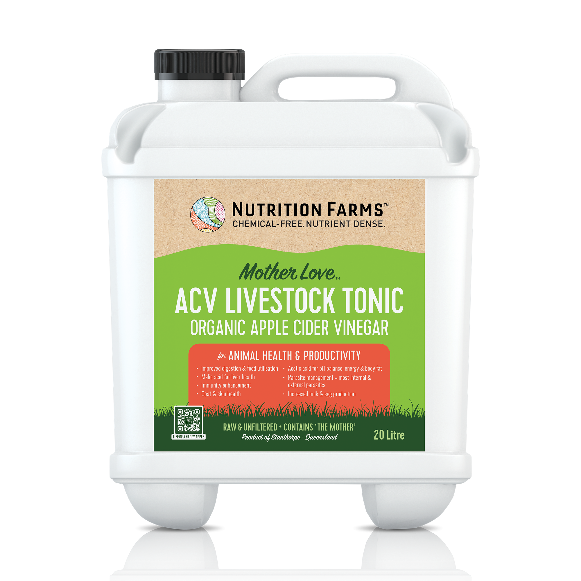 Well, thatās quite an impressive package of benefits, and it seems like a good time to talk to you about a new product from Nutrition Farms. We have recently launched our own apple cider vinegar supplement for animals and birds. Itās called MotherLove ACV Livestock Tonic, and itās made from the nutrient-dense, chemical-free, Happy Apples grown at Nutrition farms. It is derived from the same blend of four organic apple varieties that is the basis of our award-winning cider, so the flavour and quality are exceptional. However, it is the long fermentation that magnifies the mother and her medicinal gifts. In fact, this is a 2-year ferment, and the mother is both abundant and active. As far as I am aware, this is the only long ferment, unpasteurised, unfiltered, organic ACV produced in Australia, and Iām proud of it.