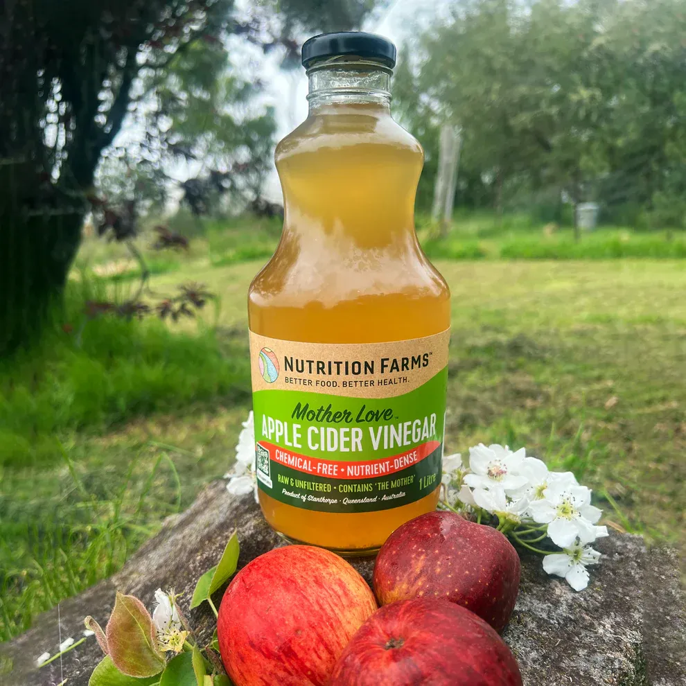 Mother Love Apple Cider Vinegar - a premium, Australian-made, organic vinegar crafted from the finest, chemical-free apples grown at Nutrition Farms in Queensland's granite belt region. Made with a unique blend of four apples, this vinegar boasts a delicious taste that's sure to delight your taste buds.