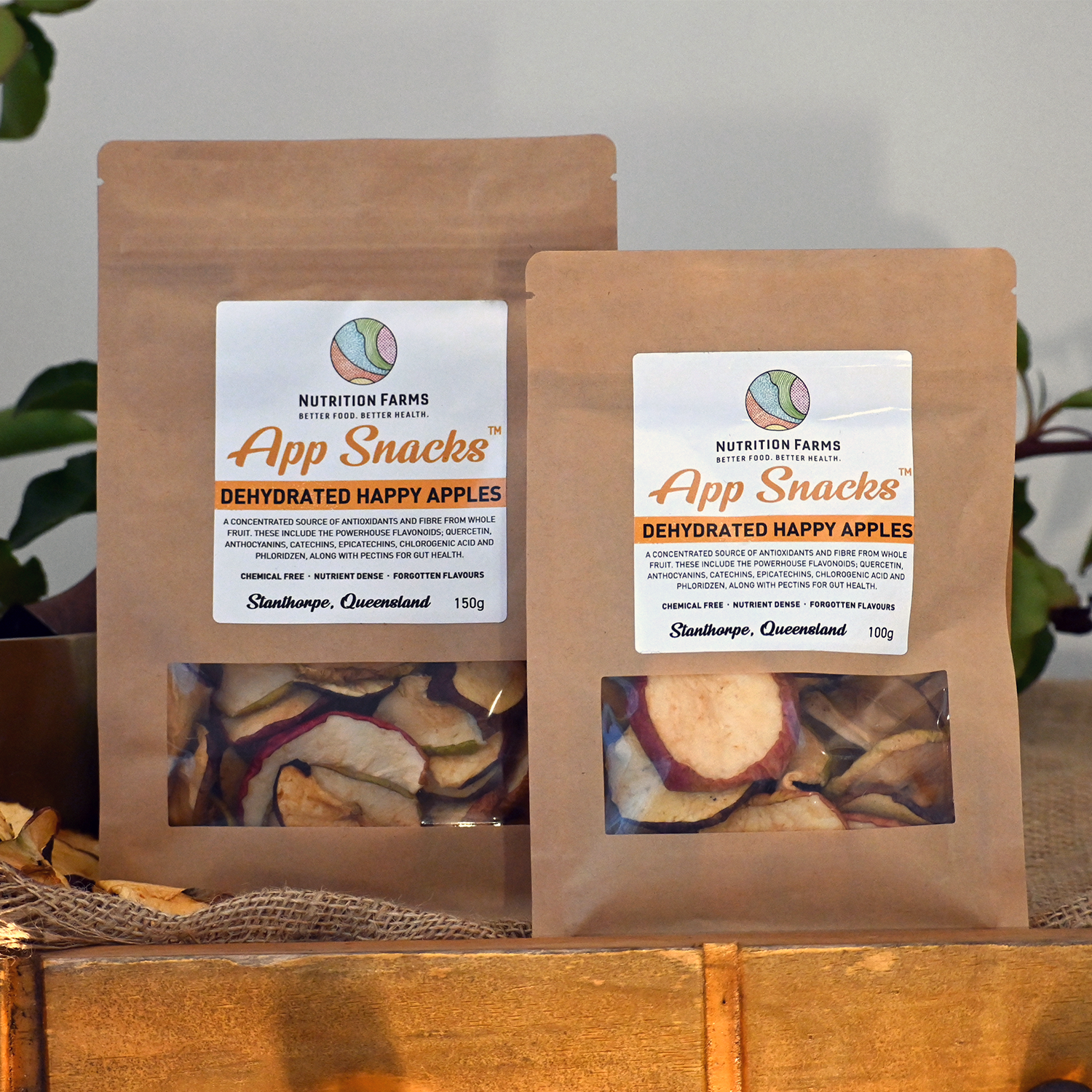 App Snacks are a sweet, tangy, chewy treat, based on dehydrated Happy Apples. These dried super snacks involve the whole fruit, including the skin and the core, for all the reasons you now understand. In fact, they are an eight times concentrate of all of these benefits, and they are the perfect lunch box additive, as children love them. Nuku, my three year old grandson, will eat a whole 150 gram packet in a single sitting, if we do not ration this treat. I find it tremendously satisfying to think that this precious child can readily access this chemical-free concentrate of powerhouse protective antioxidants, prebiotic fibre and probiotic organisms, and, importantly, he loves them more than lollies!