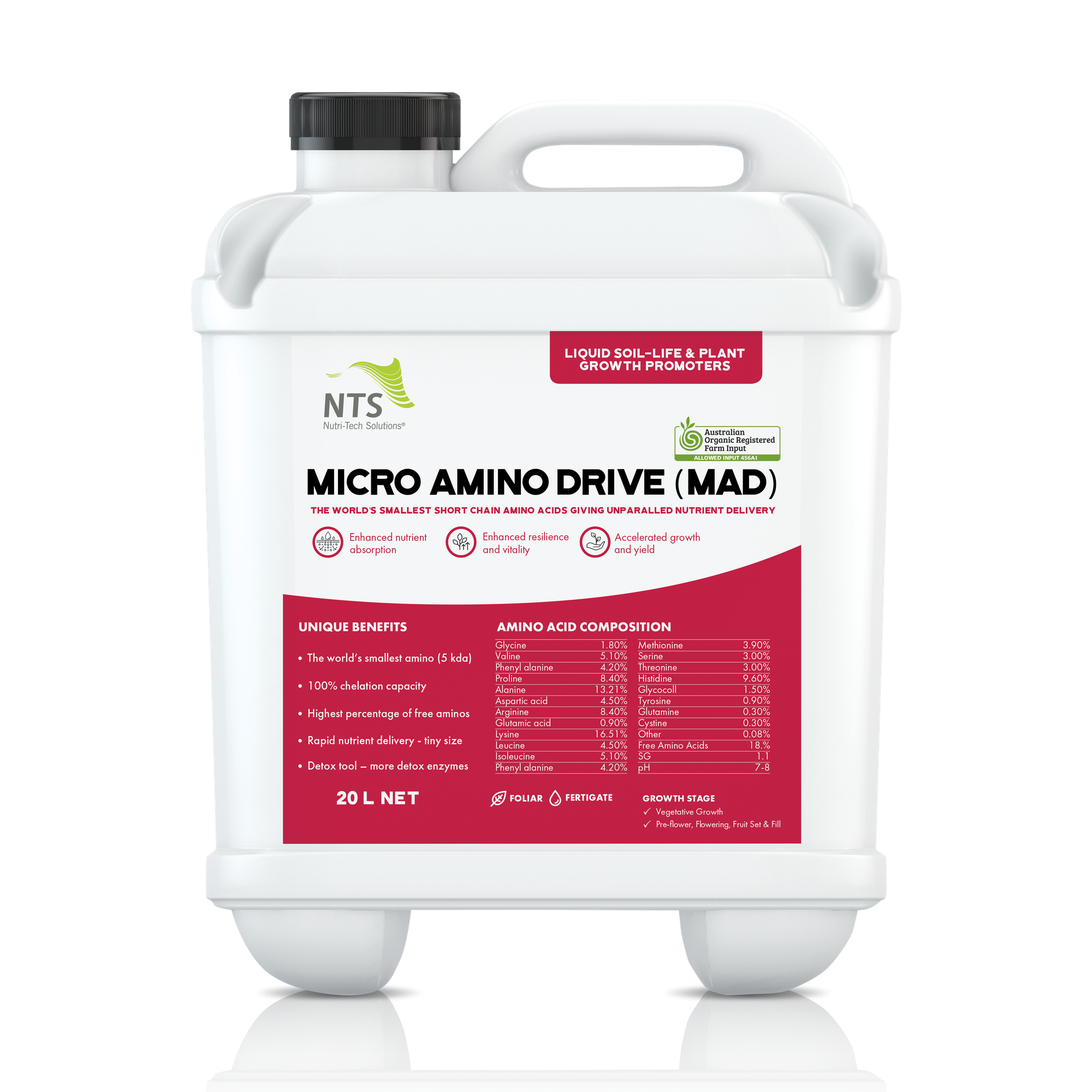 This means they can attach to minerals and smuggle them into the plant much more efficiently. It has always been recognised that glycine, the smallest of the conventional amino acids, is by far the best chelating agent. However, MAD can provide a similar rapid delivery at a fraction of the costs. Our research trials have revealed amazing plant health and vigour associated with treatment with Micro Amino Drive (MAD), as amino acids are required for every plant process.