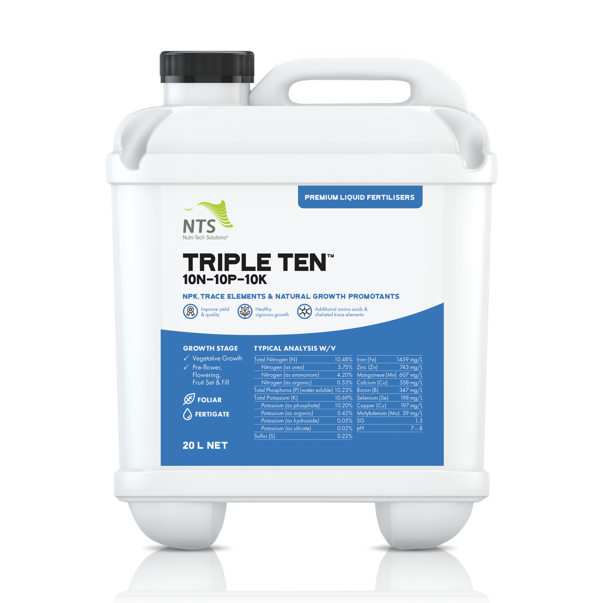 Triple Ten™ (10-10-10) is a liquid fertiliser combining a hot mix NPK blend, chelated trace elements and natural growth promotants. These natural growth promotants include fulvic acid, seaweed fertiliser and vitamins. Triple Ten™ represents state-of-the-art fusion fertilising.