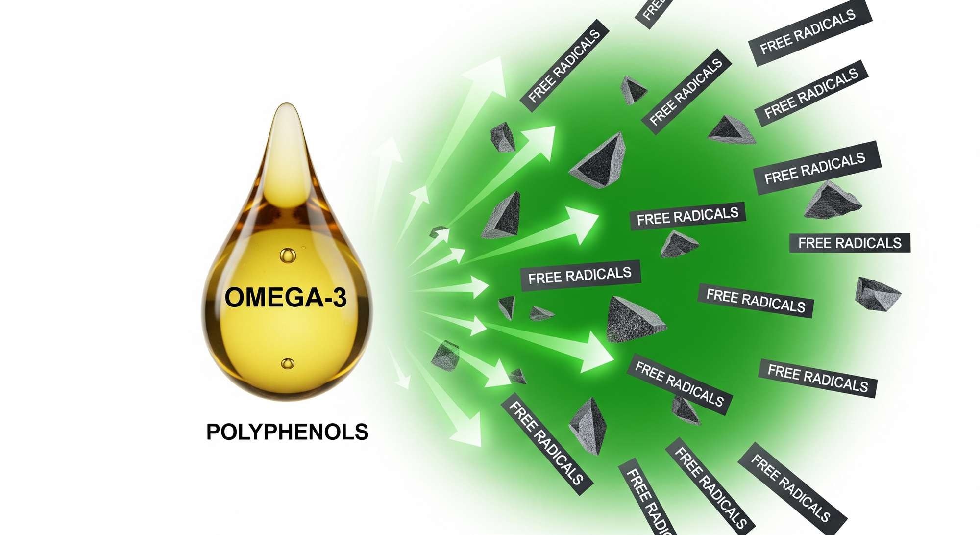 There has always been a concern that fish oil supplementation could pose problems relative to the fragility of the DHA and EPA components. These omega-3 fats are really easily oxidised. Thatās why you store flaxseed oil in the fridge, and you never cook with it. Polyphenols are amongst the most powerful antioxidants, and they effectively prevent the oxidation of the fish oil (understanding that oxidised fatty acids are never good for us!)