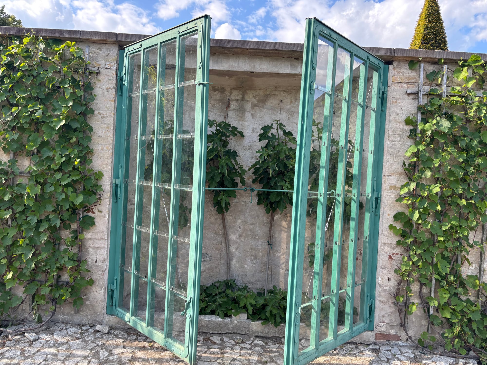 The Rococo-designed palace is positioned on a terraced hillside above expansive gardens, parks, fountains, and forested areas. The King must have had a serious love of figs and wine. The paved terrace walls are covered in trellised grape vines, selected from the finest wine grape varieties found in France, Italy, and Portugal. 168 mini-greenhouses, positioned between the vines, contain 500 pruned fig trees.