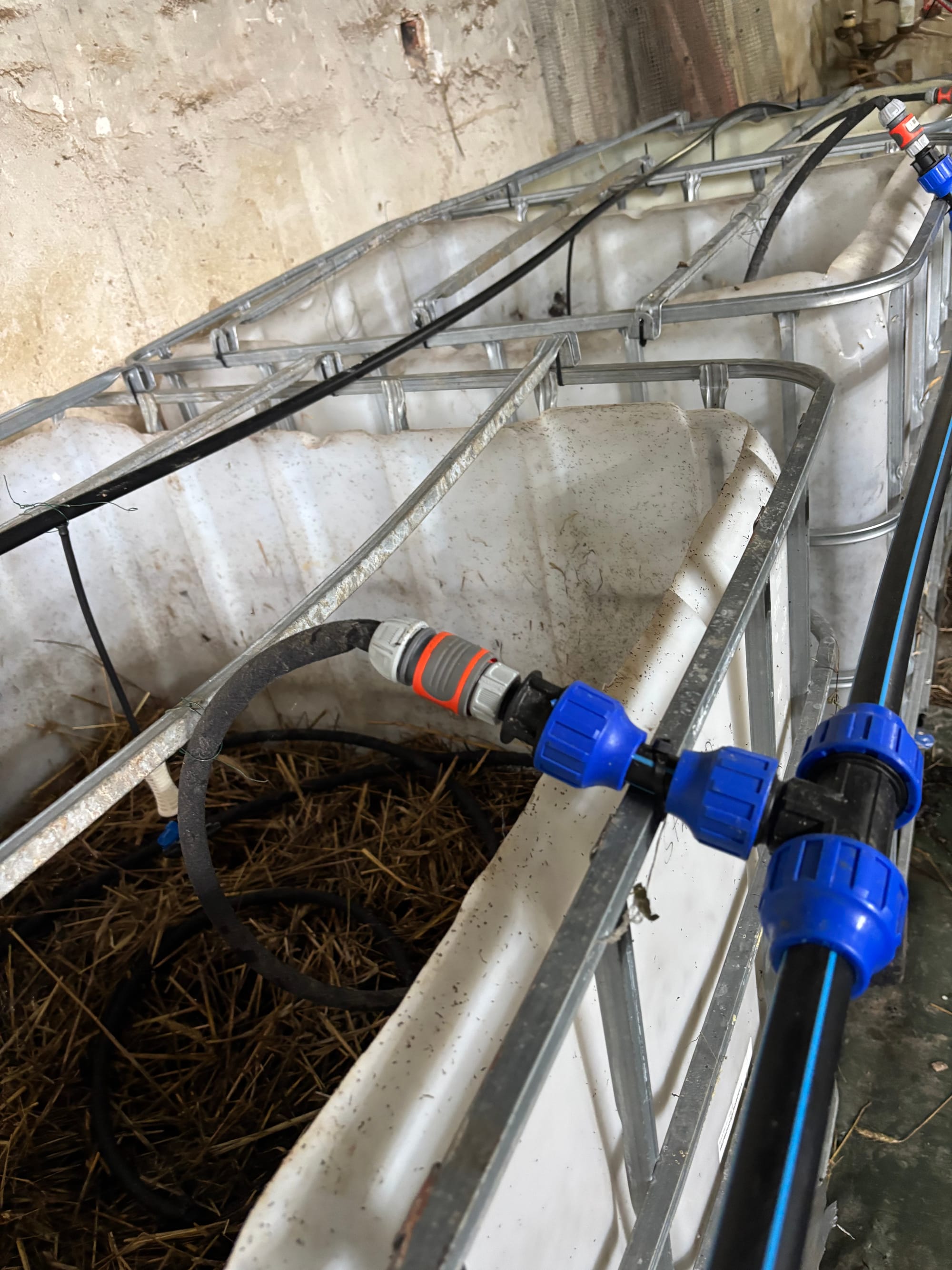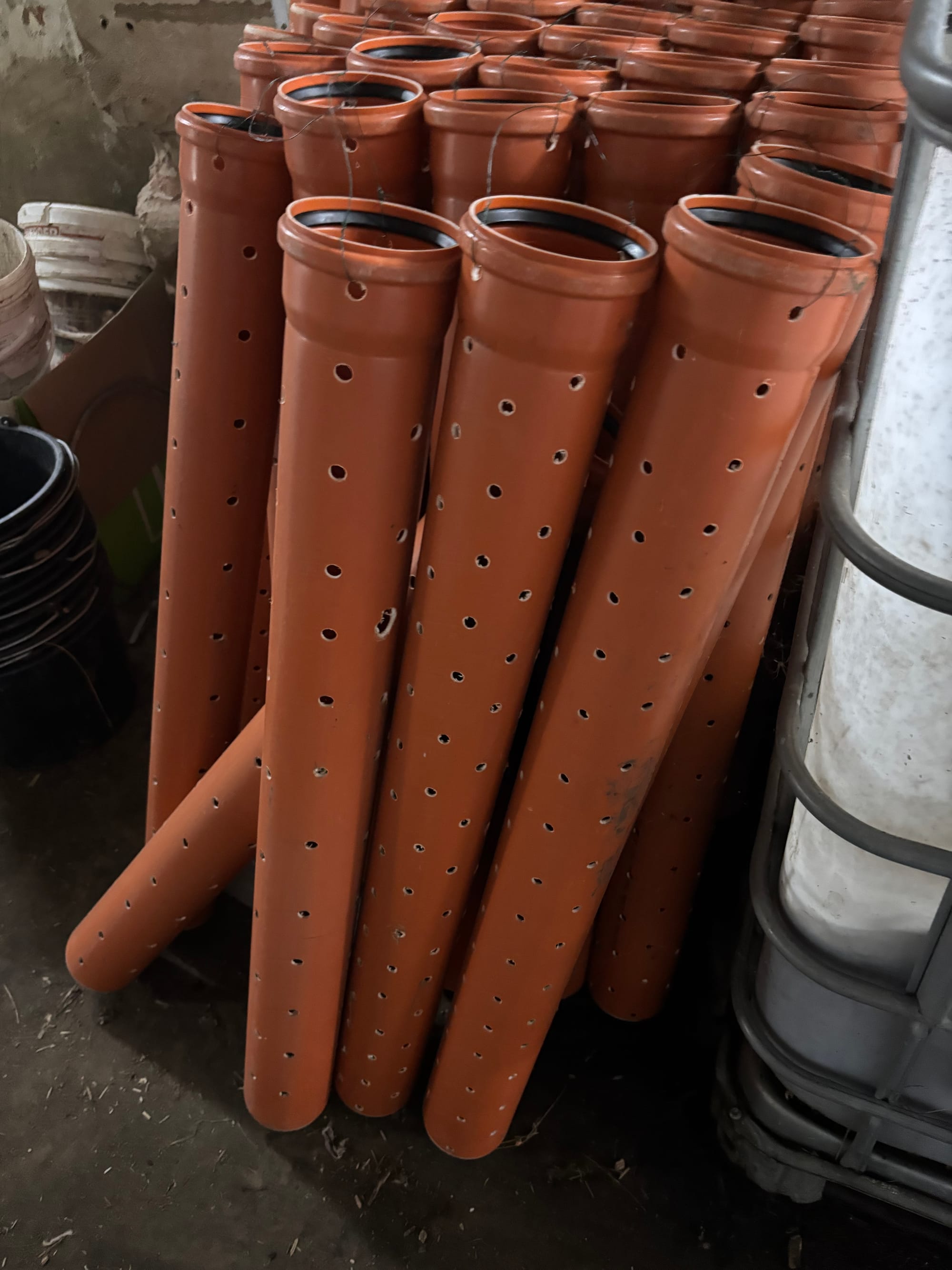 Laurenz has also been creative with other popular biological strategies. For example, he has developed a variant of Johnson/Su bioreactors that works well. Typically, growers remove the plastic tub from a 1000-litre shuttle (tote) and then line the alloy frame with landscaping fabric. This creates an enclosed, cubic-metre space in which they build their slow-cooked compost. Laurenz cuts the top off the 1000-litre shuttles but retains the plastic tub. He drills multiple 2 mm breathing holes in the base of the tub before positioning the decapitated IBC on a wooden pallet. The enclosed compost breathes from beneath and via the 4-inch breathing pipes that are inserted at the start of the process. The pipe holes remain for the 12-month composting process, so the compost is breathing beautifully from above and beneath. We have seen many Johnson/Su setups during this tour, and many of them have been open on all sides, held together with chicken wire. These units have always felt too dehydrated during the heat of summer. It makes much good sense to better retain that moisture enclosed within solid sides, while still ensuring optimum breathing.