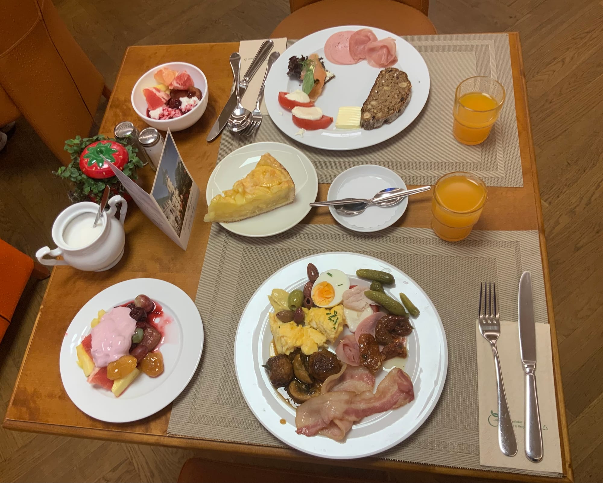 The breakfasts in the hotel were delicious, and we were able to subscribe to my defensive eating plan, where we try to make every plate a rainbow. This practice relates to the fact that plant pigments (colours) are protective tools for the plant, and it is no accident that they are among the most powerful antioxidants for us. Each colour has a different effect. They might be fat-soluble (i.e. Vitamin E) for the heart and brain, or water-soluble (i.e. Vitamin C) for distribution via our circulatory system. It can be a really productive wellness strategy to paint the plate in as many colours as possible whenever we eat. These breakfasts were our first chance to create that palette.