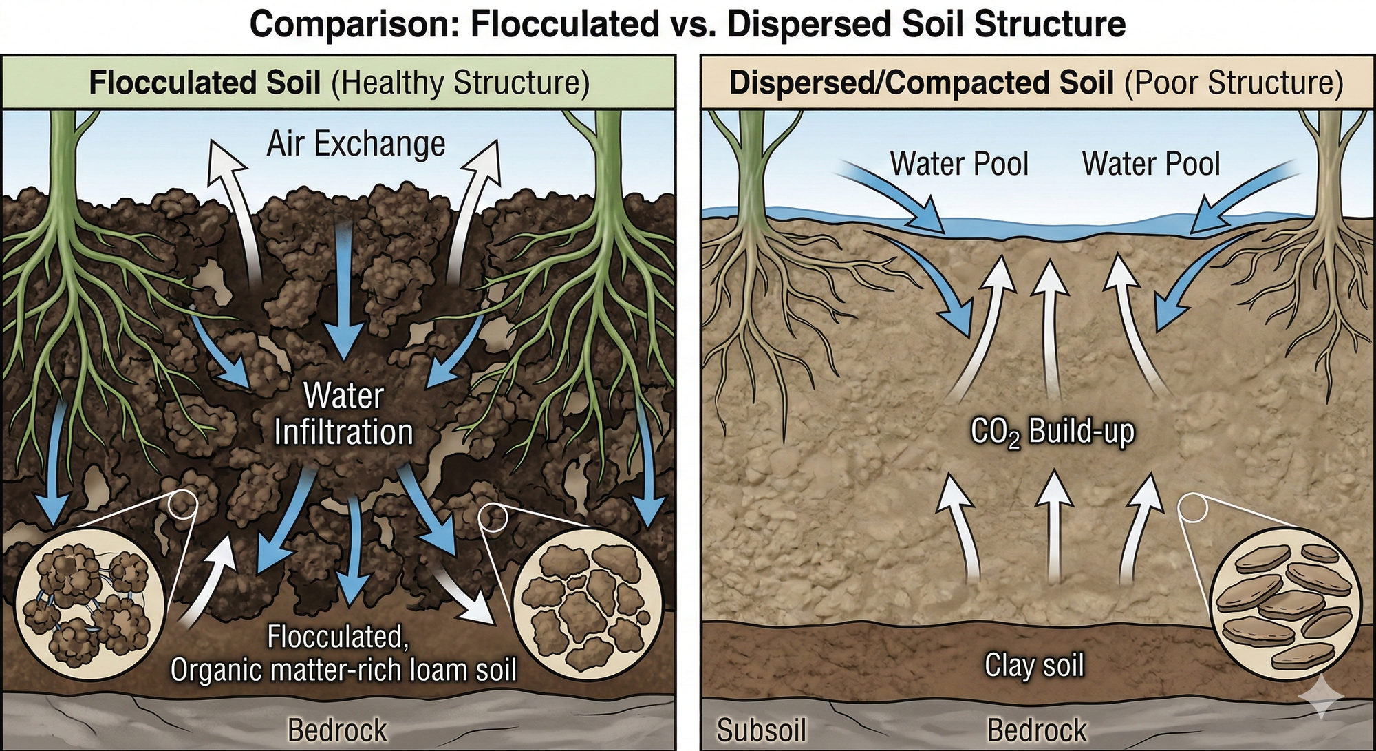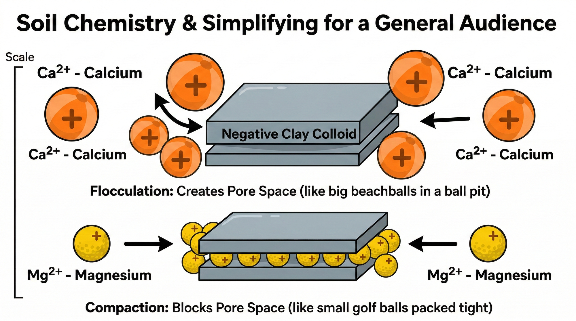 Calcium is a large ion with two positive charges (a divalent cation). Picture it as a beachball with a positive charge on either side. Clay is the main vehicle for calcium storage in the soil. The clay colloid has negatively charged sites, a little like Velcro, that attach either side to the beachball. This effectively pushes apart the clay and the soil breathes (flocculation).