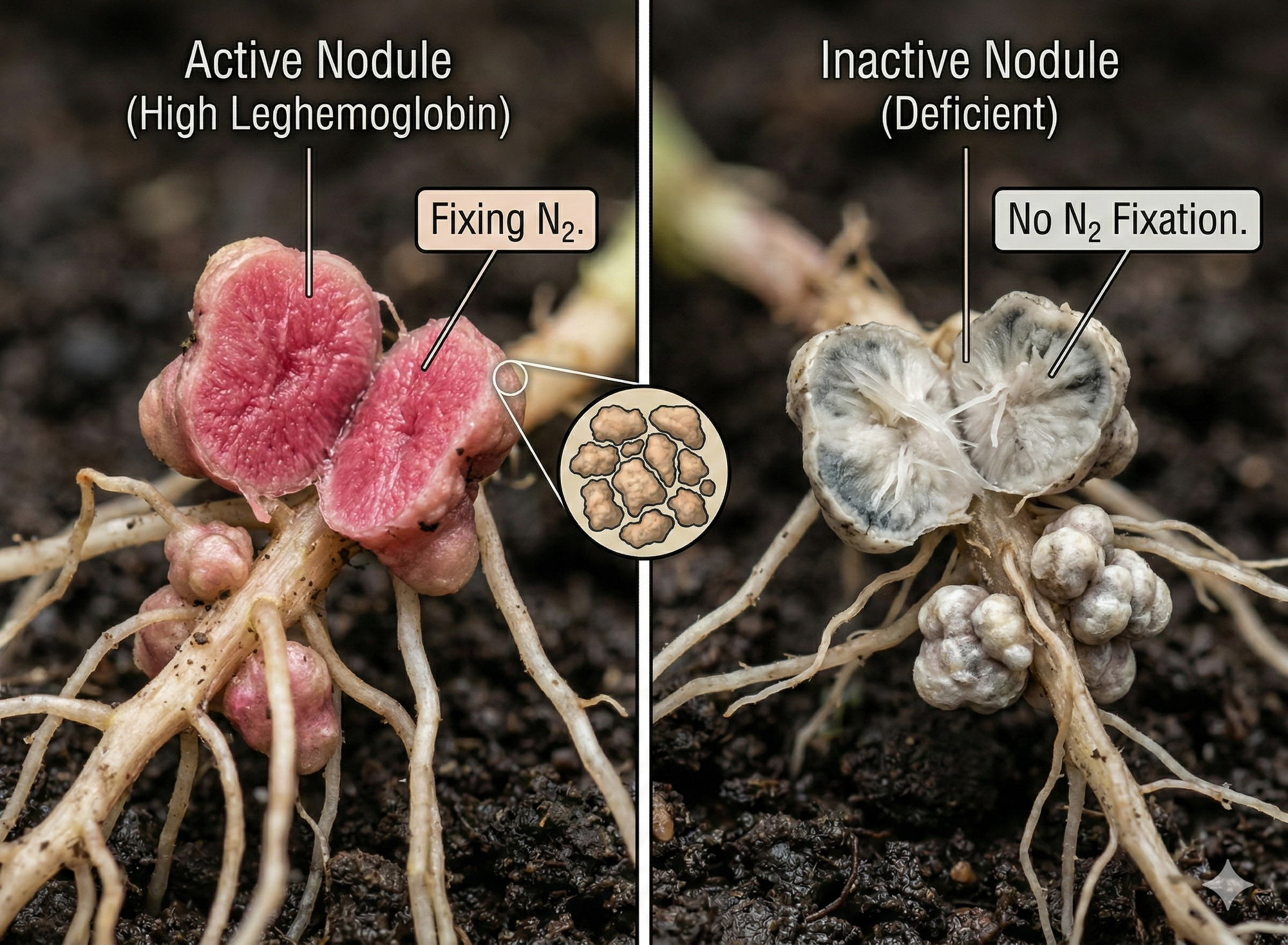 The reddish coloured pigment within the nodule indicates whether or not that plant is fixing nitrogen. This substance is appropriately called leghemoglobin and it is, in effect, the blood that determines most of the beneficial characteristics of legumes. If your nodules are an anaemic grey colour, you are not accessing what I call, âthe free giftâ- the 74,000 tonnes of nitrogen gas hovering above every hectare.